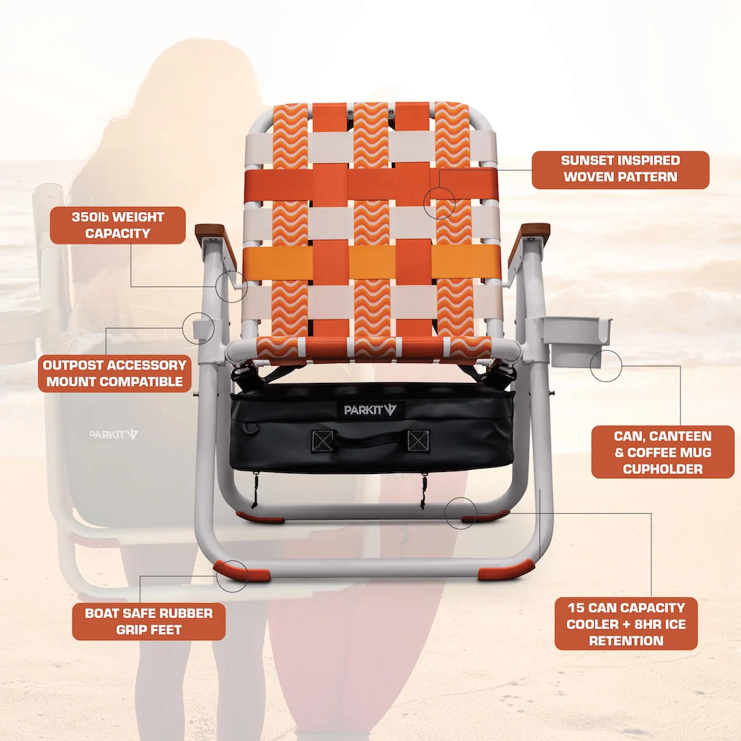 Framed in PARKIT’s signature Voyager chair design and built with stainless steel and aerospace-grade aluminum hardware, Sunkissed delivers all the 3-in-1 features you know and love: an integrated cooler to keep drinks cold, ergonomic overlander carry straps for easy transport, and a durable woven seat built for years of sun-filled days.